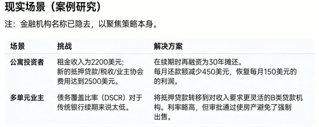 - 另类贷款机构方案:对接那些依据房产自身价值和潜在租金收入来评估交易的贷款方。它们通常比传统银行更灵活,尤其适用于特殊房产或投资组合。